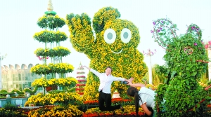 此次世界花卉大觀園菊展的主花壇“海寶”中心花壇高5米、寬2.5米,是8個技術工人連續工作48小時才搭建完成的。而鳳凰造型菊黃色的鳳身、粉色的鳳翅、紅色的鳳尾,一株菊花樹上開出了三種顏色,算得上是藝菊種植和造型上的高難度動作了,惹得不少市民紛紛和彩鳳合影。