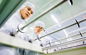 這是技術人員正在檢查玻璃原片的潔凈度。TCO玻璃是制作薄膜太陽能環保電池的關鍵原材料之一,目前南玻集團年產能40萬平方米,約占國內市場需求量的3.5%。(深圳特區報記者 許業周/攝)
