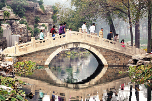 這里用精雕細刻的態度打造傳世精品。他們在山石、湖泊、橋梁、亭廊、綠化等建設細節上很是下了一番工夫。山是北寧的根。疊翠山原本是水泥澆筑的,很不自然,這次全部采用燕山山脈的天然石材,可以說移來了北京的一座山。山間藤林環繞,溪水飛湍,別具北方山林特征。水是北寧的魂。由于多年圈占、填塞,原來11.7公頃的活水成了死水、腐水。這次改造運用現代技術溝通了園內七大湖,并使園內水系與新開河連通,死水變活水,達到水清、水滿、水流,呈現煙波朦朧之態。建筑是北寧的形。21座亭臺樓榭各具情態,穿廊渡橋曼妙多姿。改建后的長廊貫通起來達2000延米,特色鮮明,成為中國長廊之最。在花窗、小品建設上采用了框景、對景、借景等手法,體現了中國園林博大自然的意境。建絲縫墻專用的小青磚比平時的磚體積大,價格是紅磚的4倍,使用時拿專用鋸六面切割,然后磨平、拋光,做到磨磚對縫。彩繪運用傳統老工藝,用磚灰、桐油、白面、豬血調和而成做底仗,具有永不褪色的特點,使用五灰三油一麻,保證彩繪不起鼓不崩裂。綠是北寧的神。綠化面積22.3萬平方米,采用對植、叢植、群植、孤植等方式,使賞花、觀果、葉木、藤蔓、水生等植物生態自然、相映成趣。
