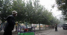 9日,石市園林部門專門調(diào)來(lái)一輛滅蟲(chóng)車,對(duì)石市紡織局宿舍院內(nèi)的受害樹(shù)進(jìn)行了噴藥滅蟲(chóng)。十幾分鐘的噴藥完成后,幾棵法桐下竟下起“蟲(chóng)雨”。