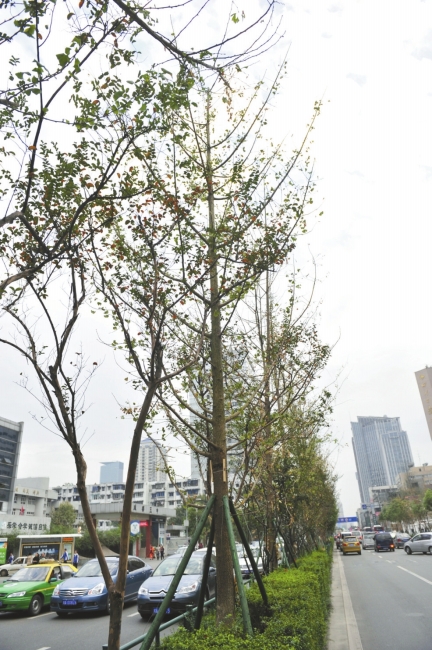 當(dāng)年紅星路道路擴(kuò)寬時(shí)淘汰掉了枝過(guò)于茂密的法國(guó)梧桐,之后,紅星路上行道樹(shù)一直處于“不夠挺拔”的狀態(tài)。據(jù)錦江區(qū)園林和林業(yè)管理局局長(zhǎng)劉波介紹,紅星路上缺乏彩葉樹(shù)添彩,這樣一來(lái),成都市市樹(shù)銀杏樹(shù)自然成為最佳選擇。據(jù)了解,為了請(qǐng)這些銀杏樹(shù),紅星路景觀提升工程耗資300萬(wàn)。