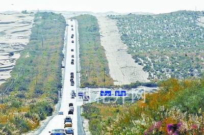 這是綠化帶掩映下的塔里沙漠公路。為防沙固沙,沿塔里木沙漠公路全線形成阻、固、輸、導(dǎo)、控相結(jié)合的防沙體系,僅北段公路編扎的蘆葦方格面積就達(dá)2000萬平方米。截至目前,全長436公里、寬度為72米到78米的綠化帶全部建成,總面積達(dá)3128公頃。