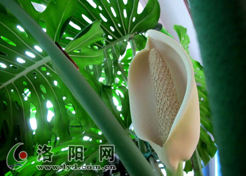 21日上午,在楊師傅家客廳窗臺上,記者見到了這株令人稱奇的龜背竹:高近2米、冠徑1.5米。子中挺立著一朵淡黃色的花朵,花高約20厘米,花蕊類似玉米棒,花體像一只大海螺(如圖),散發出淡淡的幽香。在郁郁蔥蔥的枝葉襯托下,花朵煞是嬌艷。