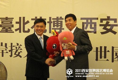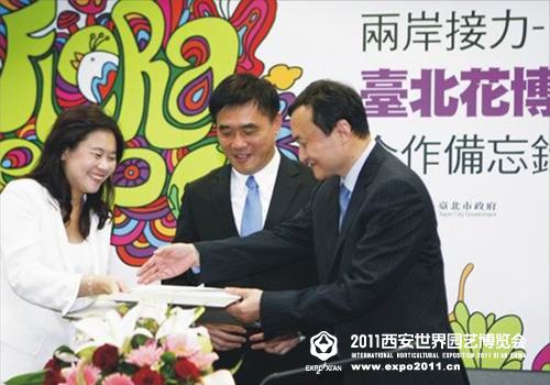 2010年7月22日,2011西安世園會(huì)執(zhí)委會(huì)副主任,西安市委常委、宣傳部長(zhǎng),西安浐灞生態(tài)區(qū)黨工委書記王軍與臺(tái)北市前副市長(zhǎng)李永萍簽署了《兩岸接力-臺(tái)北花博西安世園合作備忘錄》。雙方承諾共同在文化與園藝上進(jìn)行密切的交流與合作,并在臺(tái)北花博會(huì)和西安世園會(huì)期間相互參展,以促進(jìn)兩地的園藝文化交流。