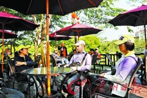 20位讀者代表隨后前往二沙島發(fā)展公園,環(huán)著公園一周做“拜客”。廣州市林業(yè)和園林局相關(guān)負(fù)責(zé)人介紹,這里原來(lái)只是一片大草坪,并不對(duì)外開(kāi)放。今年廣州興建綠道以來(lái),在發(fā)展公園內(nèi)已經(jīng)建了好幾條穿梭大坪的綠道,其中還有若干個(gè)驛站提供給市民休息,并免費(fèi)提供手機(jī)充電和上網(wǎng)服務(wù)。