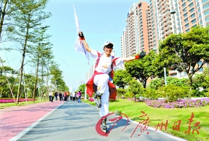 “這還不算最遠(yuǎn)的呢!”20位讀者代表中,有一位市民不是“拜客族”,卻是滑輪高手,住在羅沖圍的李輝人稱“輝哥”,昨日他帶來(lái)了獨(dú)特的行頭單排滑輪和亞運(yùn)旗幟,走在人群中向市民宣傳亞運(yùn)。“最遠(yuǎn)的一次,我從沿江路滑滑輪回到羅沖圍,綠道建成之后,提供給市民健身的場(chǎng)所更多了。”