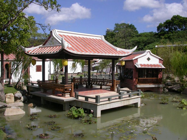 改建原林安泰古厝的花茶殿,坐落于2010臺北國際花卉博覽會新生公園區內,林安泰古厝初建于清乾隆48年(約公元1783年),為中國傳統四合院閩式風格建筑,外觀是依照民間地理風水習俗而建造,其屋脊結構采一條龍的單脊做法,以燕尾曲線呈現自然柔和的風貌;精細的雕刻,以六條龍交錯盤結,和蝙蝠、盤牌皆具有吉祥富貴意義,成為林安泰古厝重要標志。整體格局嚴謹、雕刻典雅,是臺北市保存最完整的古厝建筑,至今已擁有超過200年的歷史。