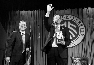 中文系大二同學潘子豪十分幸運,他在上周五接到系里發來的短信,被告知想要聽英國首相演講的同學需要回復學號和姓名,先回復的同學有機會參加。“我以前在電視里見到過卡梅倫,知道他是最年輕的英國首相,非常英俊,具有偶像氣質。希望能親眼目睹他的風采,就馬上回復報名了。”中文系四個年級只有14位同學獲得了與卡梅倫“面對面”的機會。據說,由于報名人多,學院最終采取抽簽方式選學生。
