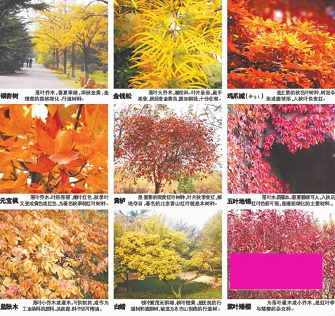 同時,記者了解到,根據葉子顏色不同,秋季觀賞的彩葉植物又分為秋葉金黃的,如金錢、銀杏、懸鈴木、樸樹、白蠟、鵝掌楸、梧桐、石榴等;秋葉由橙黃轉赭紅的,如櫸樹、水杉、柿樹、元寶楓等;秋葉紅艷的,如雞爪槭、烏桕、火炬樹、鹽膚木、楓香、紅葉石楠、爬山虎等;而漆樹科、槭樹科、殼斗科櫟屬,以及薔薇科的花楸、櫻花等,則因樹種、品種的差異呈現出更加豐富的色彩變化。
