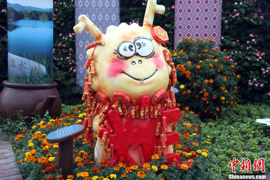 在臺北花博花圃競賽區內,連日來,島內各縣市政府紛紛在此“斗艷”,以庭園造景藝術手段凸顯各地特色及形象。圖為人文資源豐富,多姿多彩的苗栗縣展示的龐大造景群的一角。 中新社記者 王健 攝