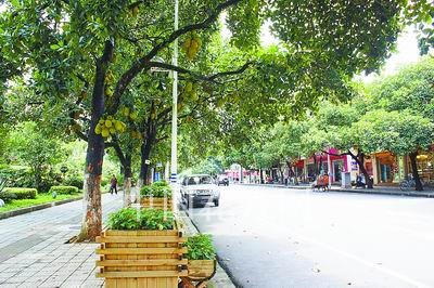 據芒市建設局副局長彭小波介紹,該市2000年提出打造“花果園林城市”綠化思路,到2008年全市綠化共栽植菠蘿蜜、龍眼、杧果等果樹約1.4萬株;2009年至今,通過小景點建設、城區主要街道綠化改造、河道改造及拆墻透綠等工作,又新植喬灌木果樹2萬多株。不僅“花果園林城市”初現雛形,還形成了花開四季、果結終年的特色景象!2009年街頭綠化果樹總產量達20噸,我們將一部分水果送給孤兒院、敬老院、低保困難戶等,另一部分通過舉辦宣傳芒市建設‘生態花果園林城市’為主題的水果品嘗活動,使廣大市民共享城市之果的喜悅感,引導市民爭當‘愛綠、護綠、惜綠’好市民,擴大城市影響力!迸硇〔ㄕf。