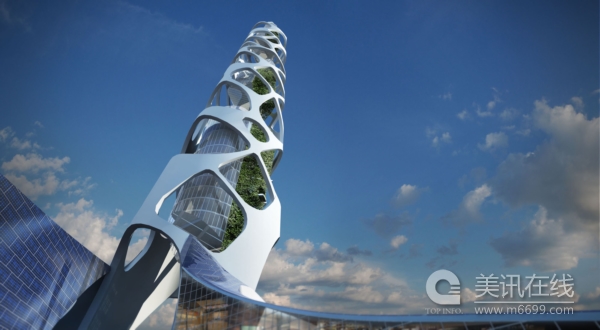 建筑內部設計采用象征式的雨林設計,能給當地社區帶來活力,振興地區發展。建筑外部結構具有很好的穩定性,并在不同水平位上設置平臺,模仿大肚山的山脈。這些“山脈”內設有可居住的空間,內有茂密的植物和天空花園,可以清新空氣。太陽能電池板組成的天篷遮罩著整個建筑,為大樓提供干凈的能源。