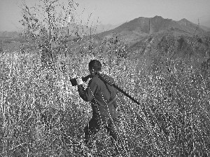 一小時間,獵手們在掛扯衣服的荊棘和削尖的荊條茬間穿行,除幾枚褪色的蛋殼外,一無所獲。偶爾有一只山雞從身邊猛然躥起,但沒等獵手反應(yīng),山雞已快速飛出,然后落在跟它相同顏色的雜草叢中。