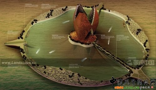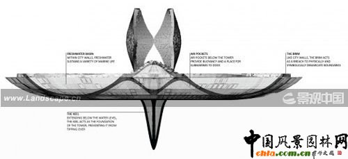 隨著人口的增長,建筑中還可以增加許多插件部分,增加建筑高度,擴展建筑范圍,這就像填海工程一樣。海平面下有長達800米的“倒置塔”,可以維持建筑直立漂浮,不會傾倒。圍繞在建筑周圍的是一個巨大的碗狀結(jié)構(gòu)既可以提供浮力,又可以像“護城墻“一樣保護建筑不受海水的侵襲。這個漂浮島將乘風(fēng)破浪,環(huán)游世界,直到找到一片富饒美好的新天地。