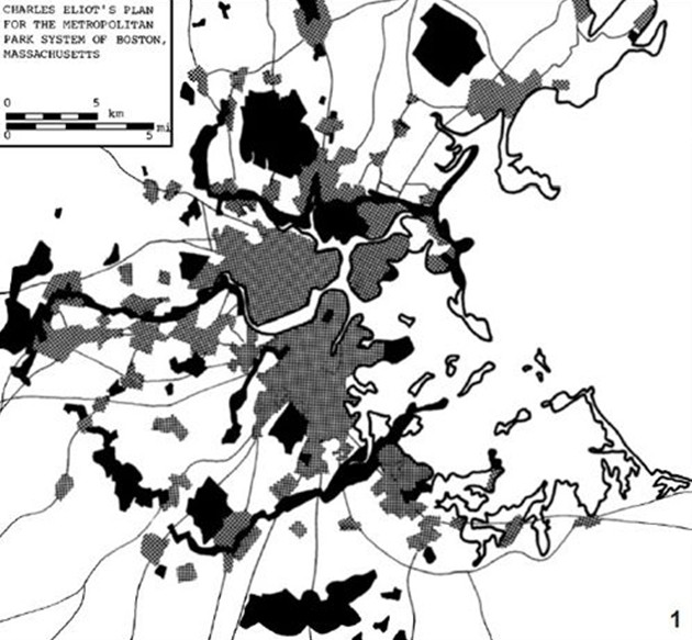 大多數文獻認為,綠道思想的源頭可以追溯到Frederick Law Olmsted和他1867年所完成著名的波士頓公園系統規劃(Boston Park System)。該規劃將富蘭克林公園(Franklin Park)通過阿諾德公園(Arnold Park)、牙買加公園(Jamaica Park)和波士頓公園(Boston Garden)以及其它的綠地系統聯系起來。該綠地系統長達25 km,連接了波士頓、布魯克林和坎布里奇,并將其與查爾斯河相連。其后,Charles Eliot擴展了他的思想,將其綠色網絡延伸到整個波士頓大都市區,范圍擴大到了600kin ,連接了5條沿海河流。