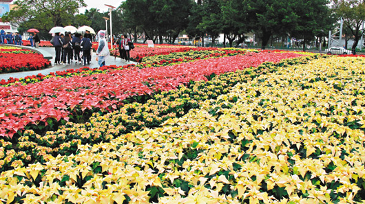 圓山園區地景花海及精致花卉區,12月上旬才剛換花,種上大片圣誕紅,占地4300多平方公尺、共有32種、合計超過7萬株,是全臺面積最大圣誕紅展示。