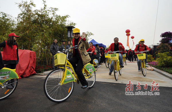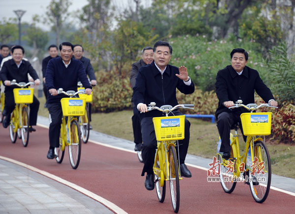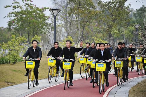 1月5日,在珠三角省立綠道網全線貫通暨青年記者綠道行活動啟動儀式后,中共中央政治局委員、廣東省委書記汪洋(左三)和與會人員一起體驗綠道騎行。(記者 梁旭攝)