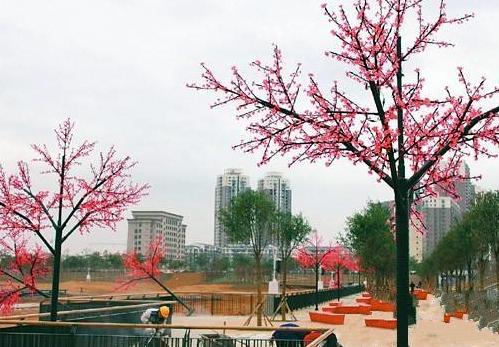 還沒有走近盤古公園,記者就發(fā)現(xiàn)了在盤古公園觀光平臺上那一排搶眼的“桃樹”。遠(yuǎn)看還以為是桃花提前綻放了,走近才發(fā)現(xiàn)原來是公園設(shè)計安裝的景觀樹燈。新裝上的12株桃樹景觀樹燈,均以桃花花朵形狀呈現(xiàn),顯桃紅色,遠(yuǎn)遠(yuǎn)望去尤為搶眼。