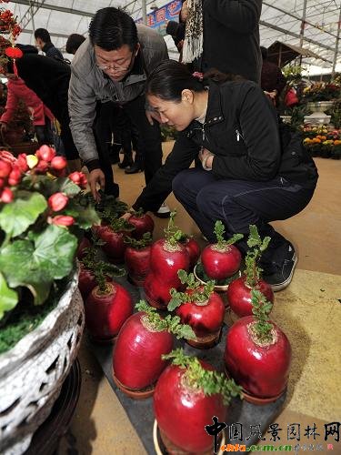 記者在陳村花卉世界花圃中看見了兔子最愛的大紅蘿卜。不過這不是普通的蘿卜,而是穿上“馬甲”,被染成特殊的紅色,栽種在小花盆中的年花。