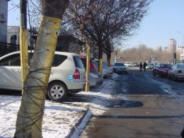 在下瓦房地鐵站附近的天津審計局門前的人行道上,筆者看到了七八棵數米高的大樹樹身上被人包裹上了一兩米長的黃色裝飾布。上面還纏綁著多條供霓虹燈照明使用的電線。看到筆者拍照,附近一家商鋪的經營者張先生告訴筆者,這個情況存在時間將近兩月多了。“是旁邊一家娛樂城為了招攬顧客所為。”筆者就此情況向河西區園林局進行了反映。負責園林監察的姓王的工作人員表示,在樹木上包裹裝飾布不利樹木自然生長,影響其吸收陽光和吸取水分,會影響樹木光合作用,對樹木生長有不好的影響,從而影響綠化景觀。他們將前往現場查看,對此行為給予處理。