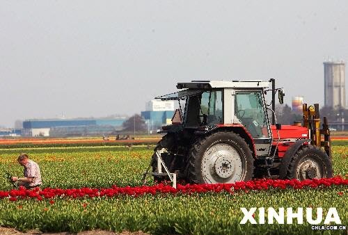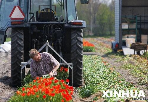 4月26日,在荷蘭西部小鎮利瑟附近的花田,一名花農在收獲郁金香。每年4月下旬到5月是荷蘭郁金香收獲的季節。荷蘭是世界上最大的花卉出口國,目前約占世界花卉出口總量的三分之二,郁金香是荷蘭重要鮮花出口品種之一。