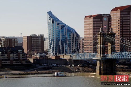 這座大廈位于辛辛那提市最著名的羅布林大橋(RoeblingBridge)旁,被稱為羅布林大橋坡度”的大廈是由紐約世界貿(mào)易中心重建總體規(guī)劃建筑師丹尼爾·李博斯金設(shè)計(jì)的。這座大樓最具特色的就是它頂層的傾斜坡度使用了仿生技術(shù)與周邊的自然環(huán)境相適應(yīng),與著名的城市標(biāo)志羅布林大橋相配合。大廈的建筑色調(diào)充分反映出了城市和天空的搭配,同時(shí),這所大廈還具有緩解交通壓力的功能。