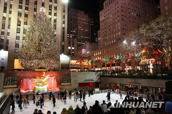 12月7日,一些游客在美國紐約洛克菲勒中心前巨大的圣誕樹下溜冰。洛克菲勒中心的圣誕樹號稱全美最有名的圣誕樹。今年選中的圣誕樹是一棵77年樹齡的挪威云杉,高約22米,裝飾有彩燈和一顆巨大的水晶星。隨著圣誕節的臨近,紐約各處的景點、商場和社區紛紛裝扮成一年中最靚麗的模樣,吸引廣大市民和游客前來參觀。新華社記者侯俊攝