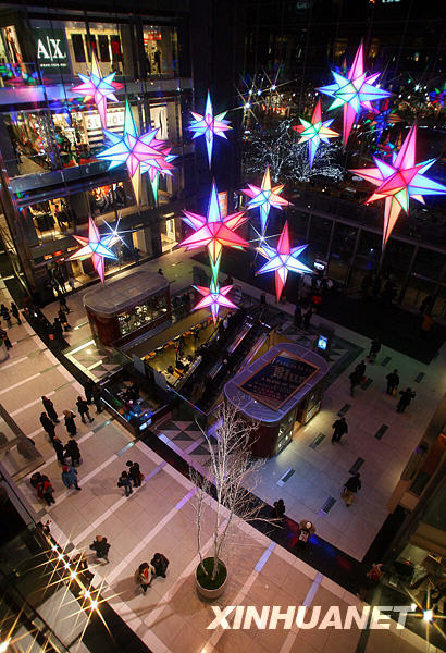 12月7日,圣誕彩燈閃耀在美國紐約時代華納中心商場的大堂上空。新華社記者侯俊攝
