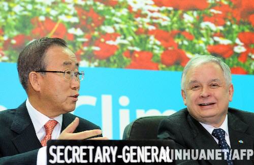 2008年12月11日,聯(lián)合國氣候變化大會高級別會議開幕。12月11日,在波蘭波茲南,聯(lián)合國秘書長潘基文(左)在聯(lián)合國氣候變化大會上與波蘭總統(tǒng)萊赫·卡欽斯基交談。當(dāng)日,聯(lián)合國氣候變化大會高級別會議在波蘭歷史名城波茲南開幕,各方將為明年年底在丹麥哥本哈根就2012年后應(yīng)對氣候變化達(dá)成新協(xié)議而努力準(zhǔn)備。 新華社/法新