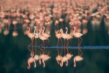 火烈鳥形似鶴,頸長而曲,腳極長,飛羽深黑,復羽深紅,體羽白中透著玫瑰紅,諸色相稱,艷麗非凡。每年年底到次年3月,是在納庫魯湖觀看火烈鳥的最佳時機。它們在湖面形成一大片織錦,偶然展翅飛翔,則鋪就漫天云霞,蔚為壯觀。納庫魯湖海拔高,湖水中有豐富的多種微生藻類及小型甲殼類生物,正是火烈鳥及鵜鶘等飛禽的美食佳肴。