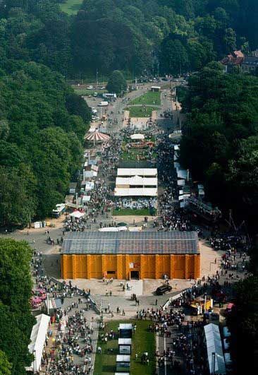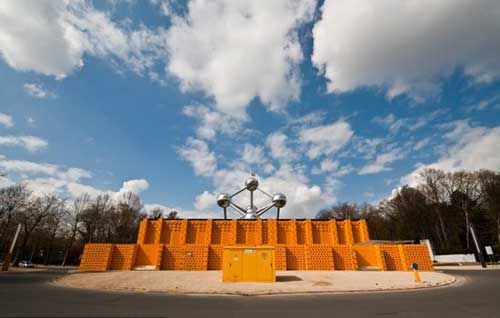 2009年8月2日,比利時布魯塞爾,用世界上最奇怪的建筑材料-啤酒箱搭建的建筑現身展覽中心,而且它是與公認為地球上最怪異地標之一的原子球塔結合在一起的。
