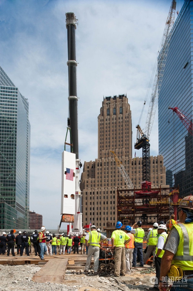 存放在肯尼迪機場17號機棚的世貿(mào)中心最后的一根鋼梁重新搬回了世貿(mào)中心遺址。覆蓋了美國國旗的鋼梁就像一位美國英雄,在工人、援助隊員和遇難者家屬的注目下,將在“9.11紀念館”永久安家。
