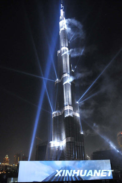 這是1月4日拍攝的位于阿拉伯聯合酋長國迪拜的“哈利法塔”(前稱“迪拜塔”)。阿聯酋當晚為高達828米的“迪拜塔”舉行盛大落成典禮,并以阿聯酋總統、阿布扎比酋長謝赫哈利法·本·扎耶德·阿勒納哈揚的名字將其命名為“哈利法塔”。新華社記者安江攝