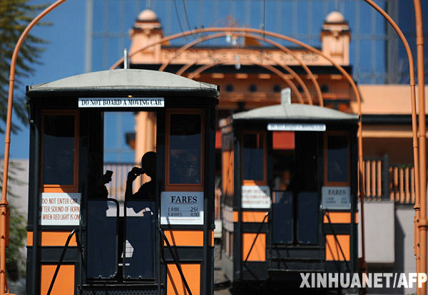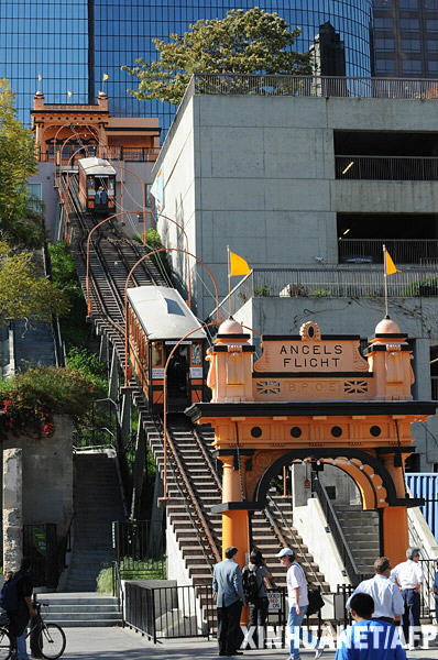 3月15日,幾名游客從洛杉磯著名景觀——天使登山纜車下走過。具有109年歷史的洛杉磯著名景觀——天使登山纜車在中斷運營9年后15日起重新開始運送旅客。2001年,纜車的一個座箱在運營過程中失控滑到坡下,撞到后面另一個座箱,導(dǎo)致一名乘客被撞死,7人受傷。經(jīng)營者被迫停業(yè)整頓。在改進(jìn)了安全裝置之后,有關(guān)部門批準(zhǔn)該業(yè)務(wù)重新恢復(fù)。