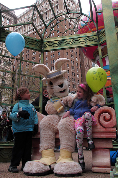 3月28日,在美國紐約曼哈頓的梅西百貨商場外,小朋友和梅西百貨花卉展上的卡通兔子合影。