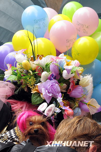 3月28日,在美國紐約曼哈頓的梅西百貨商場外,一名游客帶著她的寵物狗參加梅西百貨花卉展的寵物秀。新華社發(吳凱翔攝)
