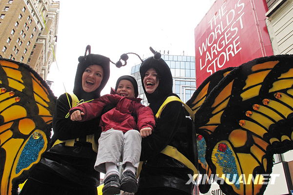 3月28日,在美國紐約曼哈頓的梅西百貨商場外,一名小朋友和“蝴蝶姐姐”合影。