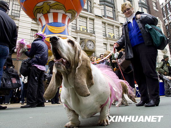 3月28日,在美國紐約曼哈頓的梅西百貨商場外,一名游客帶著她的寵物狗參加梅西百貨花卉展的寵物秀。新華社發(吳凱翔攝)
