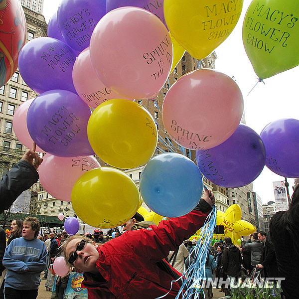 3月28日,在美國紐約曼哈頓的梅西百貨商場外,一名工作人員向行人發放梅西百貨花卉展的氣球。新華社發(吳凱翔攝)