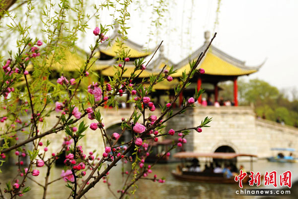 明媚的春光下,古城揚州已到桃紅柳綠時。清明假期,水、柳、花構成的揚城美景,每天都讓數萬游客陶醉其中。中新社發 潘多拉 攝