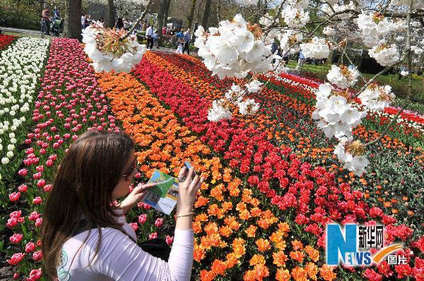 4月24日,游客在荷蘭中部城市利瑟附近的庫肯霍夫花園欣賞郁金香、風信子等花卉。庫肯霍夫花園是世界上最大的郁金香花園,種植有100多個品種的450萬株郁金香。隨著天氣逐漸變暖,郁金香和園內其他花卉競相開放,吸引了數以萬計的游客前來賞花踏春。新華社記者武巍攝