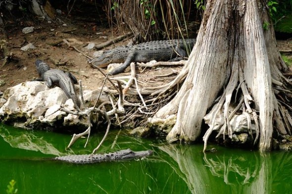 佛羅里達州的巨杉國家自然保護區,幾只美國短吻鱷聚集在一棵柏樹的樹根附近。美國國家公園管理局目前正在對八座國家公園進行監控,以隨時發現遭到墨西哥灣漏油破壞的跡象,巨杉國家自然保護區就是其中之一。美國國家公園管理局選擇監控的公園全部位于美國墨西哥灣沿岸,即從得克薩斯州延伸至佛羅里達州。