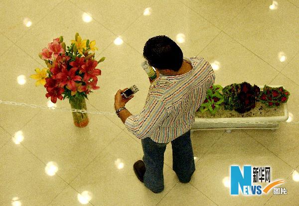 5月10日,一名游客在伊朗首都德黑蘭的對話公園拍攝展出的花卉。為期6天的第八屆德黑蘭國際花卉植物展于9日在這里開幕,70家伊朗公司和27家外國公司參展。新華社發(哈拉比薩斯攝)