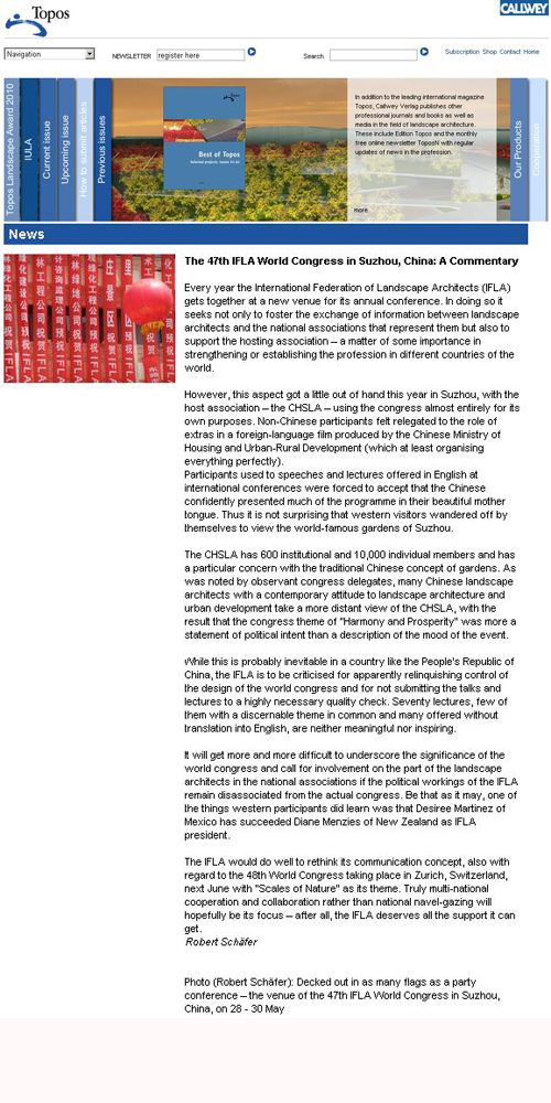 然而,對于中國來說這似乎是不可避免的:國際景觀設計師協會(IFLA)將因其對國際大會的設計顯然地漫不經心,對于提交的演講和會談沒有進行極其必要的質量檢查而飽受批評。70場主題類同且很多都沒有翻譯成英語的演講毫無意義,也沒有任何啟發價值。