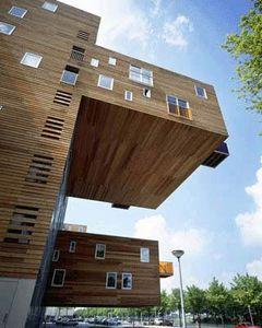 90年代末“沃佐科住宅(WozocoApartments)”是建在荷蘭阿姆斯特丹市的一種外掛式住宅,荷蘭的房屋設計規定公寓必須為住戶提供足夠多的陽光,由于有限的樓層高度和南北向的條件限制,100套公寓不可能放置在一個常規的體塊中,最多只能容納87套,為了解決高密度問題,所以設計師把另外的13個公寓掛在外面。