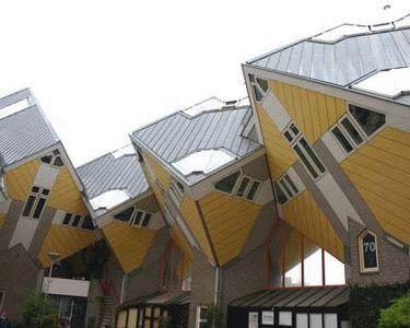 這個立方體房屋建于荷蘭,設計師把傳統的房子轉了45度,架在一個六邊形的柱子上,這樣三個面朝上,三個面朝下。每個房子有三層,底層包括廚房、書房和浴室,中層是臥室,頂層則是一個金字塔式的閣樓。