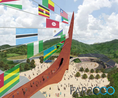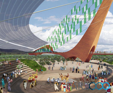 步行橋連接著場地的兩邊:接待廳和北邊的廣場。接待廳位于一個小山頂部,可看到阿布賈的市中心。傾斜的步道圍繞的圓形劇場上安裝了帶光電板的頂棚,保護了坐席區,并在夜晚給橋上的照明設施提供電能。