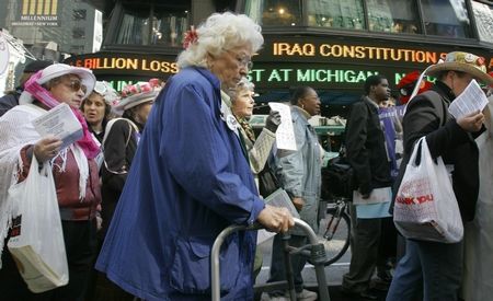 一群老人正經(jīng)過(guò)紐約時(shí)報(bào)廣場(chǎng)