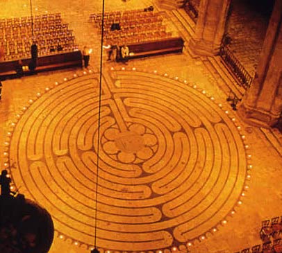 在沙特爾教堂的中殿地面上有一個螺旋形迷宮。它將中殿分成3/4開間,呈圓形,內(nèi)外總共有12圈,最后抵達(dá)中心玫瑰花似的終點。中心處以前嵌有一塊銅板,上面的浮雕是希臘神話里的忒修斯戰(zhàn)勝牛頭人身的怪物米諾陶諾斯的場景。這塊銅板繼承了克諾索斯古迷宮、及埃及古迷宮的傳統(tǒng),它們常常都在中心描繪同樣的故事。