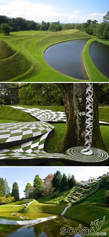蘇格蘭宇宙思考花園(The Garden of Cosmic Speculation)位于蘇格蘭西南部的鄧弗里斯(Dumfries),它是著名建筑評論家查爾斯詹克斯(Charles Jencks)于1990年建造的私家花園。花園的建造設計源自科學和數(shù)學的靈感,建造者充分利用地形來表現(xiàn)這些主題,如黑洞、分形等。盡管其實私家花園,但是它通過蘇格蘭花園計劃(Scotland's Gardens Scheme,SGS)每年開放一天以為慈善團體麥琪癌癥中心(Maggie's Centres)籌款。